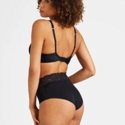 Aubade Culotte Haute Sweetessence Noir, maille, dentelle et bretelles sont conçues dans des matiÚres recyclées pour de la lingerie éco-responsable.