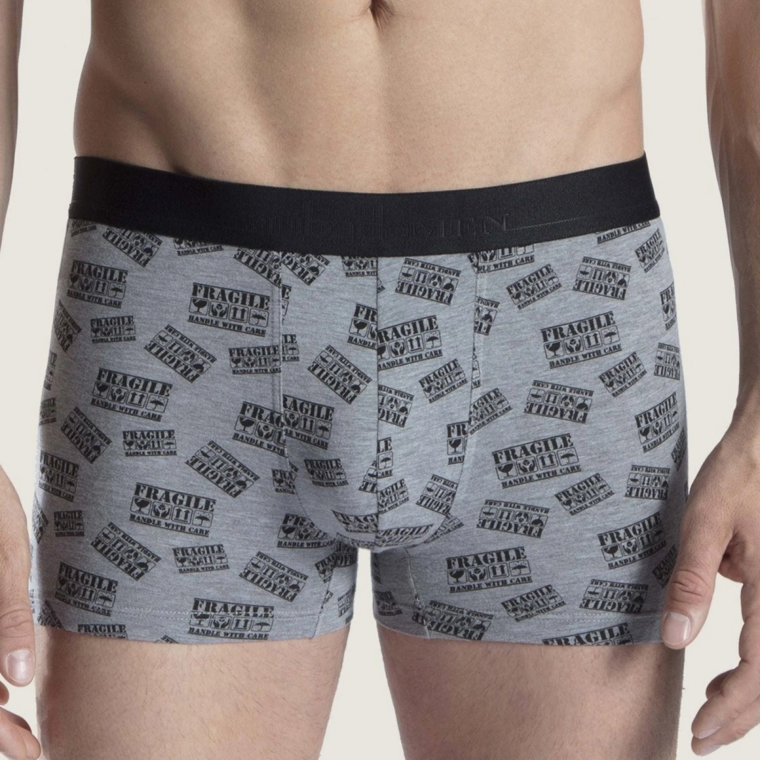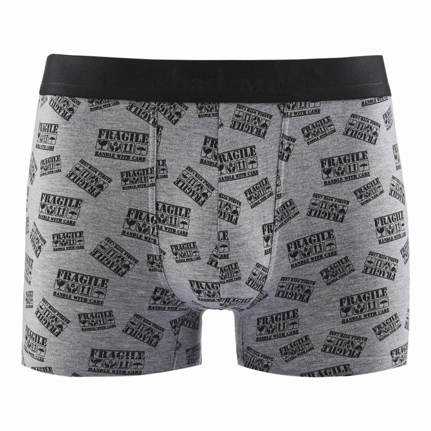 Le boxer Fragile revisite le sous-vêtement pour homme avec une touche d’humour. L’imprimé éponyme se répète dans un coloris noir sur fond gris, rendant le porté à la fois amusant et sexy.