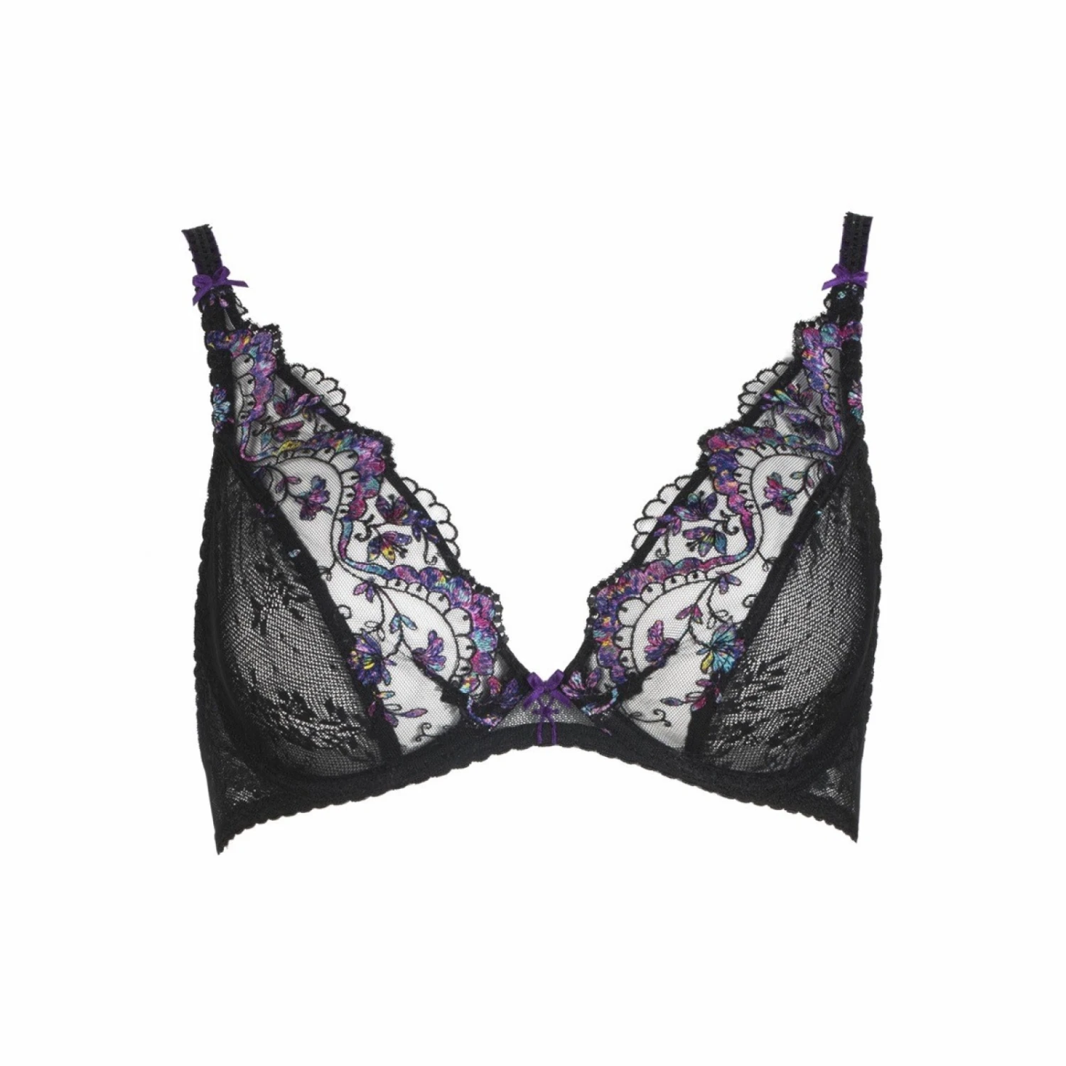 Un soutien-gorge Triangle mais avec des armatures en dentelle et Ă l’esprit vĂ©gĂ©tal : une broderie Ă l’imprimĂ© Floral sur fond noir avec des petites touches prune vives.