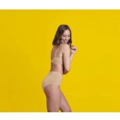 Le modĂšle taille haute se fait discret sous les vĂȘtements moulants, avec ses coutures latĂ©rales et bordures plates au niveau de la taille et des jambes.