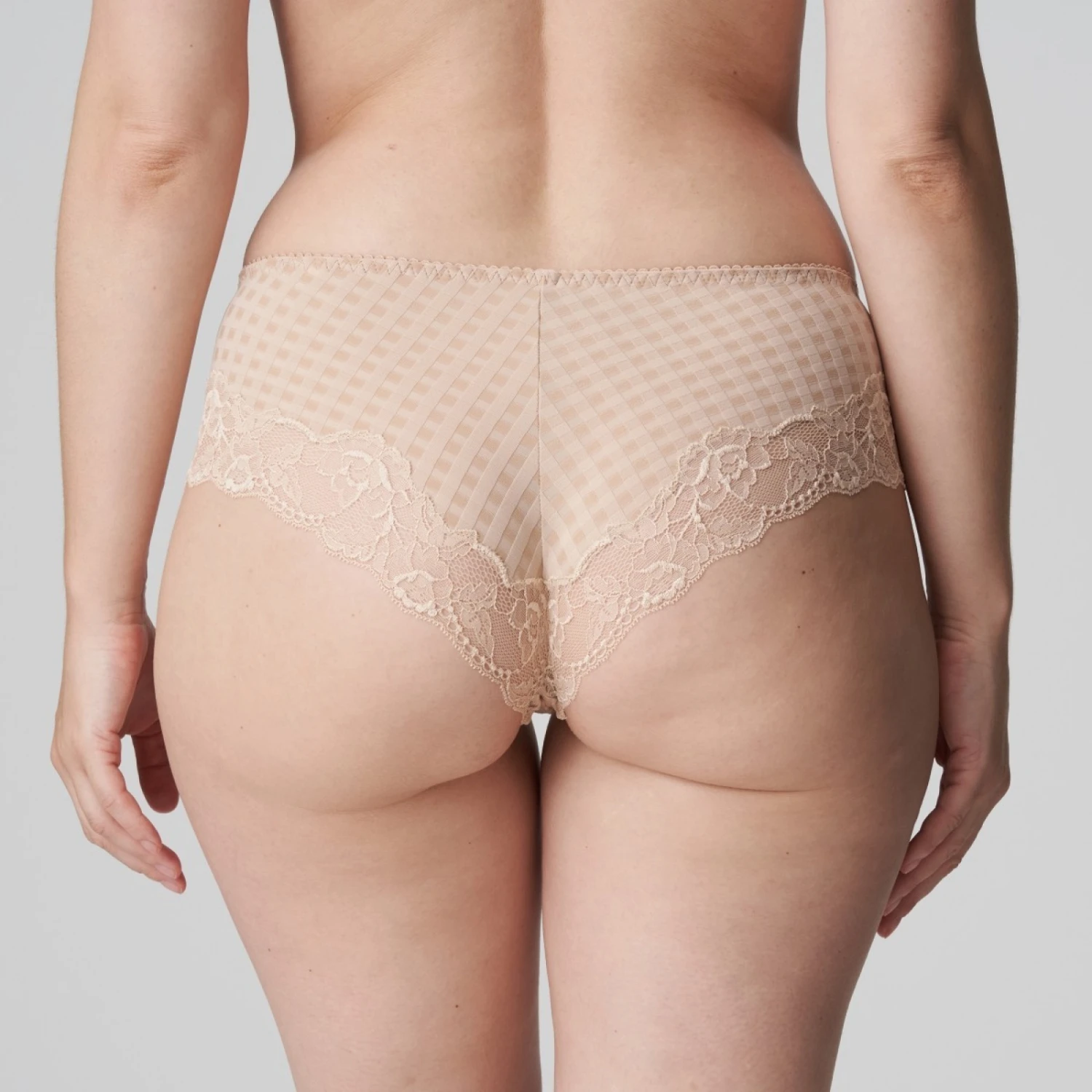 Un shorty appelé aussi hotpants affichant un motif à carreaux et de séduisantes bandes de dentelle sur les hanches, qui se prolongent sur les fesses. En coloris Café au Lait un ton chair moderne, Raffiné et élégant.