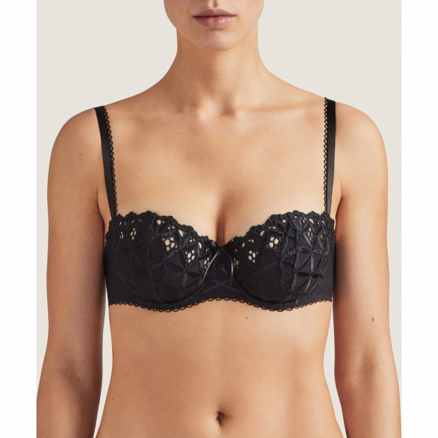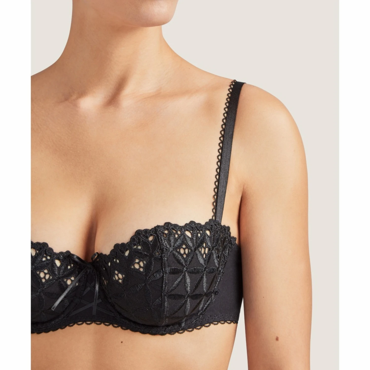 Un soutien-gorge Ă armatures avec bretelles fines, noeud Ă l’entre-sein et croquet en bas.