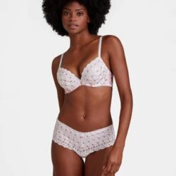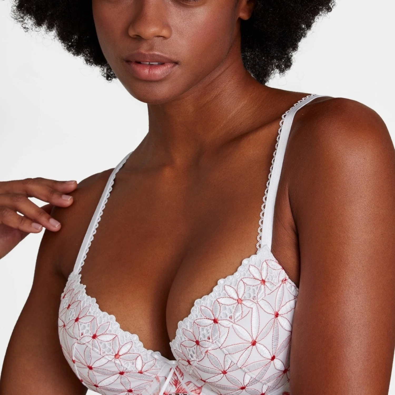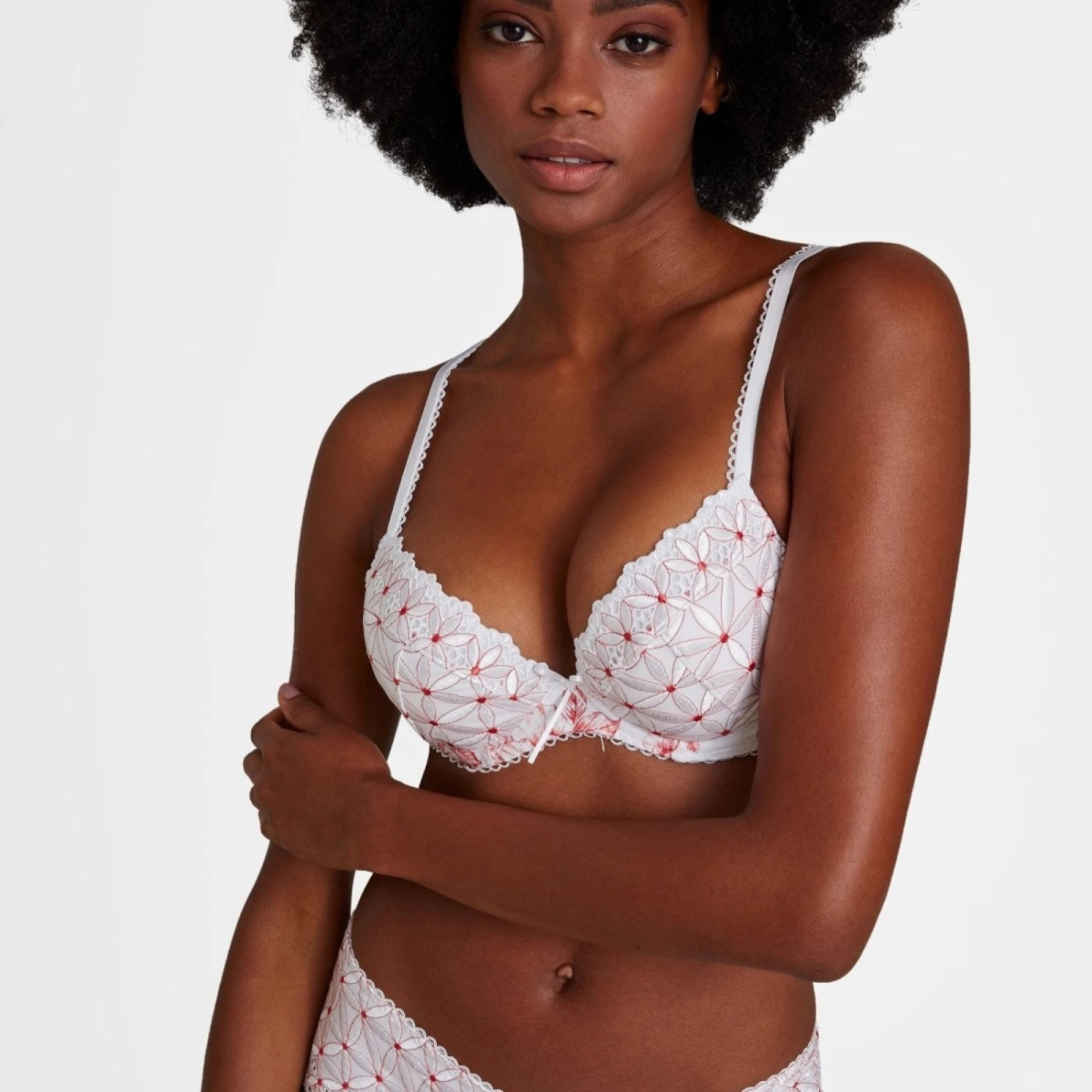 Un soutien-gorge Plunge qui rĂ©hausse la poitrine avec des coussinets amovibles jusqu’au bonnet C ( Ă partir du bonnet D le bonnet est coquĂ©)