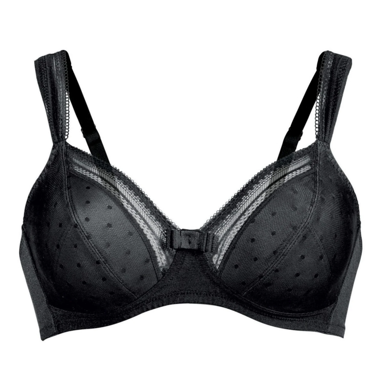 Soutien-gorge sans armatures modèle Emily en coloris Noir, un soutien gorge jeune, moderne et délicat avec son motif raffiné à petit pois de la marque Rosa Faia. Un soutien-gorge sans armatures en forme de triangle met en valeur le décolletté.